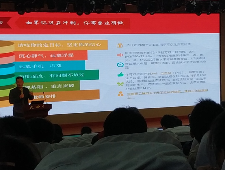张校长回顾了三年前学校在同学们进校前给予的承诺:尽一切可能将同学们送到更好的学校,增加同学们对未来的选择。当时共有58名中等以上的同学选择了大四中,现在我校已经成功保送63名同学去到市级重点学校,足以证明大四中是同学们的正确之选。
